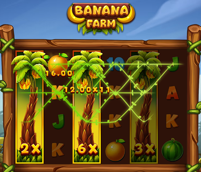 The headline max win of 25,000× your bet is what sets Banana Farm apart in the high-volatility category. That top ceiling is reachable primarily through stacked wild reels with multipliers, ideally in the bonus mode with sticky wilds locked in. While many spins will deliver smaller wins or long dry spells, the possibility of a massive payout adds serious excitement. The wild reel multiplier mechanic is the engine for those big wins: multiple wild reels with high multipliers in the same winning combination equal huge payouts.