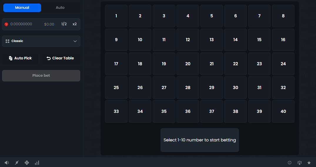 Answer: It’s super easy! In Chips.gg Keno Originals, you can select between 1 and 10 numbers from a pool of 40 tiles. Simply click your lucky picks manually for a personalized touch, or let the Auto Pick feature randomly select 10 numbers for you; perfect if you love an element of surprise or want to play fast.